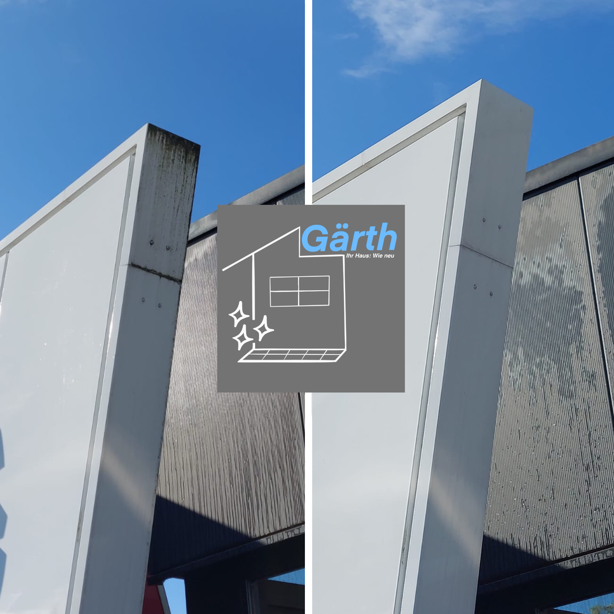 Gärth Logo transparent – weißes Haus mit Glanzeffekt und hellblauem Schriftzug „Ihr Haus: Wie neu“