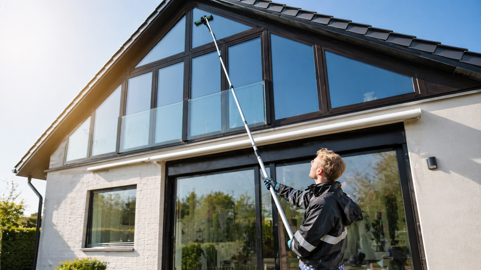 Mit Teleskopstange und Wasserführungssystem auch in großer Höhe – sicher vom Boden aus.